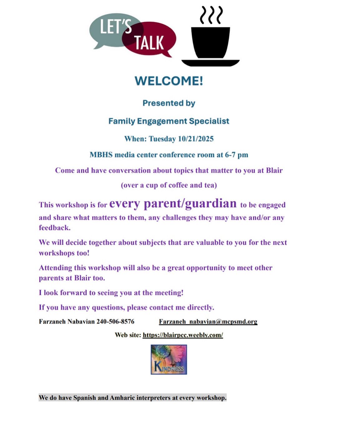 Come and have conversation about topics that matter to you at Blair (over a cup of coffee and tea) with our Family Engagement Specialist, Faye Nabavian! This workshop is for every parent/guardian to share what matters to them, any challenges they may have, and/or any feedback! More information here.